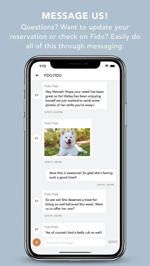 Be the master of your time. Schedule appointments for your dog at fido fido instantly. Forgot Fido's food or want to add an exit bath? Request services no matter the time of day. Check on your dog with one-on-one messaging. Get photo and video updates at your fingertips.