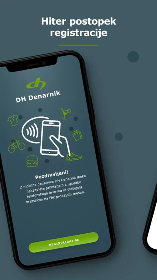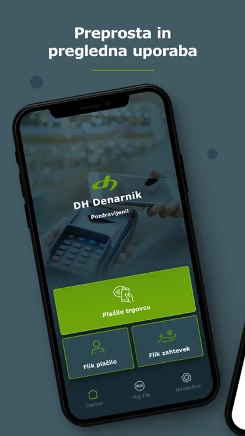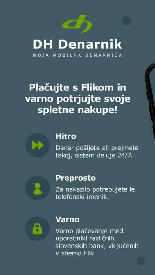 Mobilna denarnica DH Denarnik vam nudi sodoben, varen in enostaven način plačevanja z mobilnim telefonom. Aplikacija omogoča izvrševanje takojšnjih plačil Flik kontaktom z uporabo telefonskega imenika in potrjevanje spletnih plačil.
