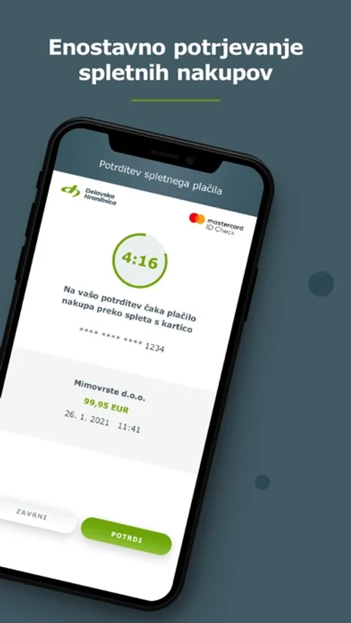Pri nakupu preko spleta sledite obvestilu, ki se vam prikaže na zaslonu spletne trgovine pri postopku plačevanja s kartico, in potisnemu sporočilu, ki ga prejmete preko DH Denarnika na svoj mobilni telefon. Vstopite v DH Denarnik, kjer se vam prikaže zaslon za potrditev plačila za spletni nakup, preverite njegovo pravilnost in potrdite.