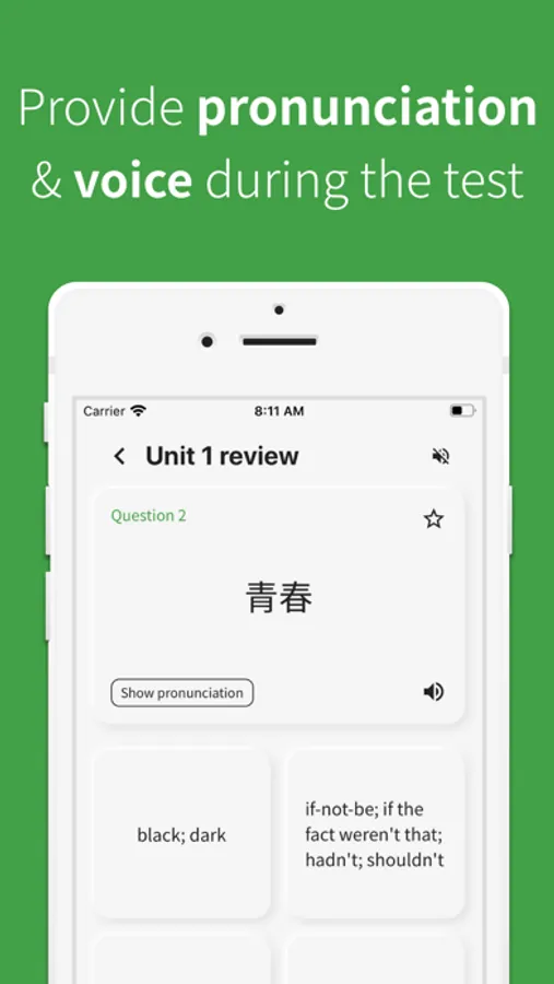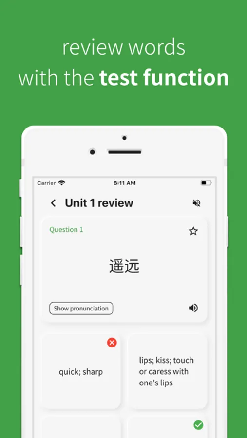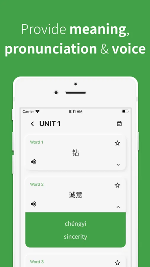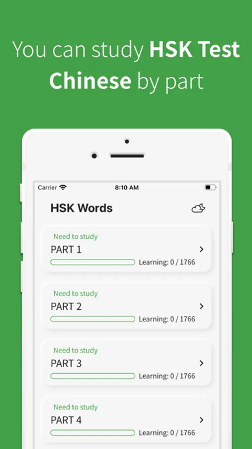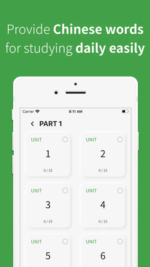 It is important to study words every day! You can review the studied Chinese vocabulary by part, unit, or whole words.