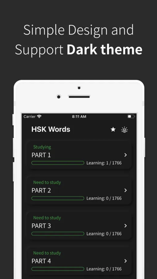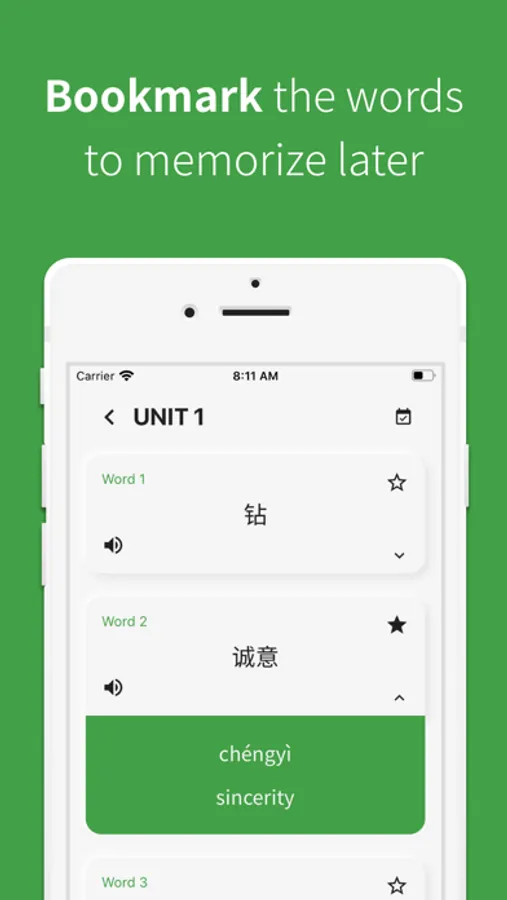 - Bookmark: you can press the star button to add the word which you couldn't memorize well to the bookmark.