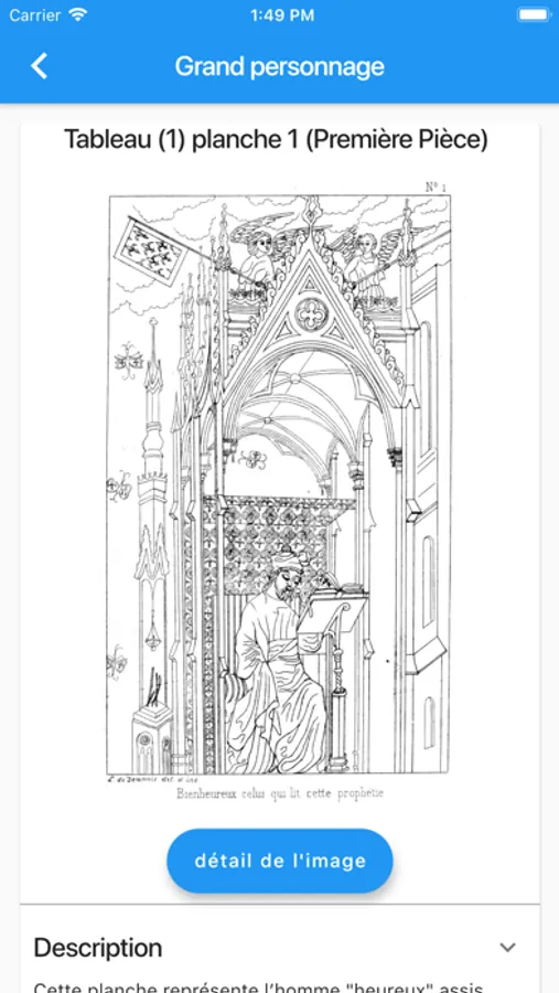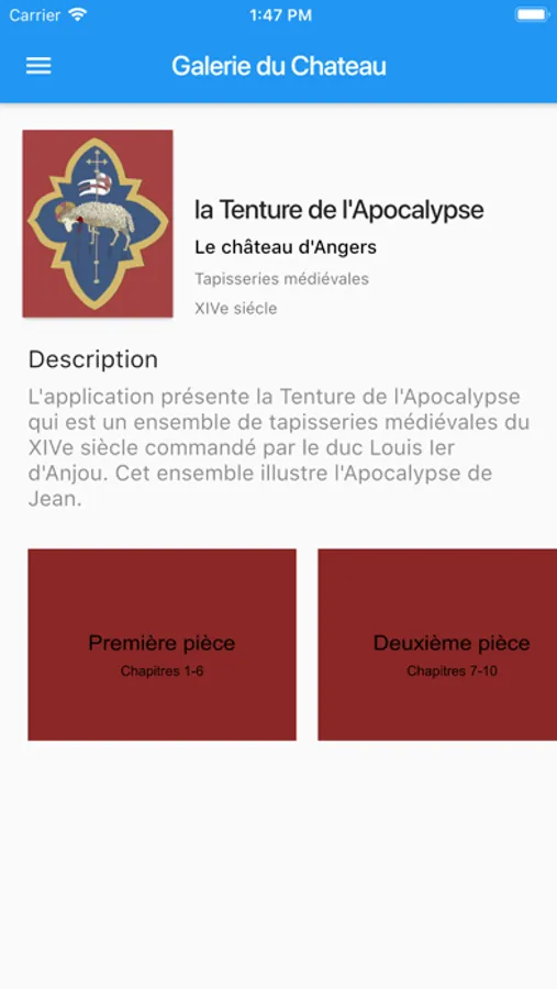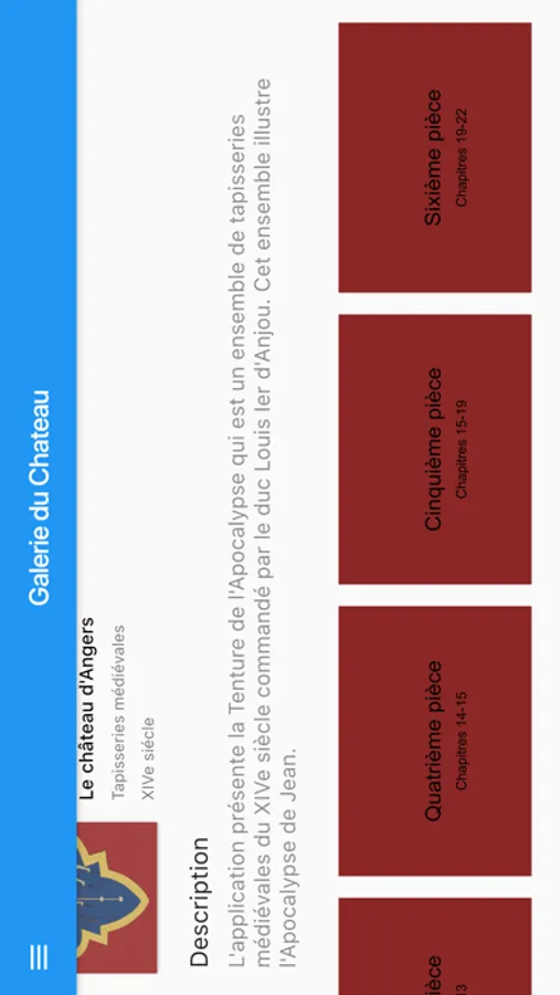 L'application présente la Tenture de l'Apocalypse qui est un ensemble de tapisseries médiévales du XIVe siècle
