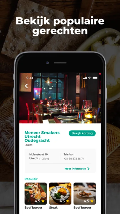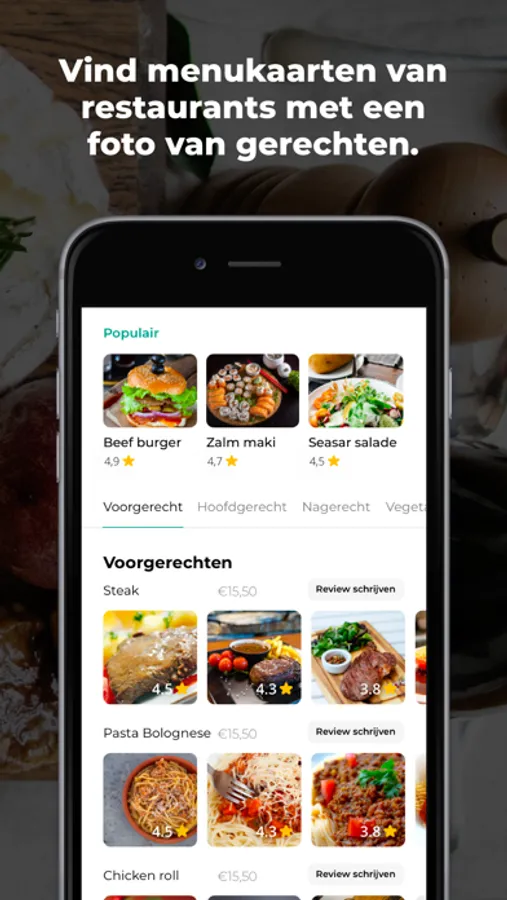 - Bekijk de volledige menukaart inclusief foto’s van gebruikers;