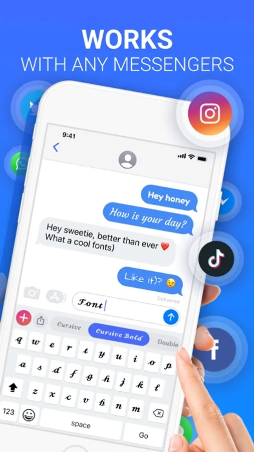 Fonts works everywhere: on Instagram, WhatsApp, Snapchat, TikTok and many other applications. Just open the Fonts X keyboard and type away.