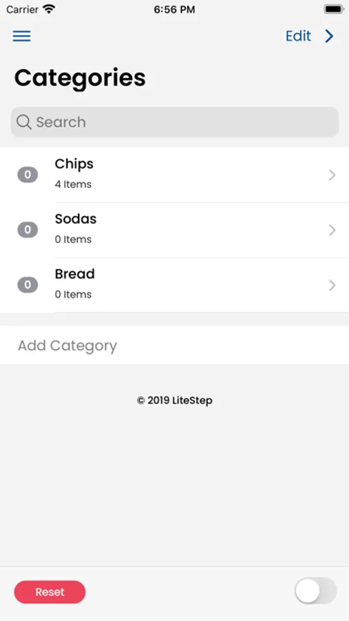 To modify the list of categories, or modify each list of items, select the edit button at the top right of the app.