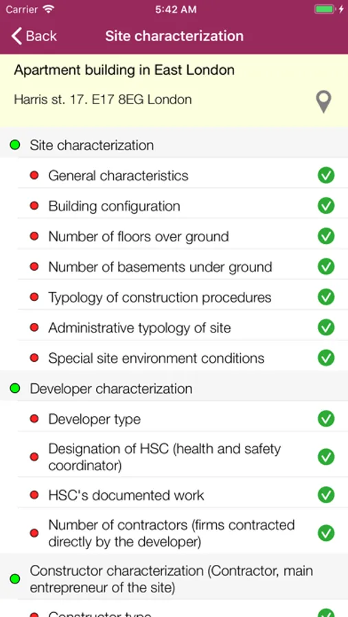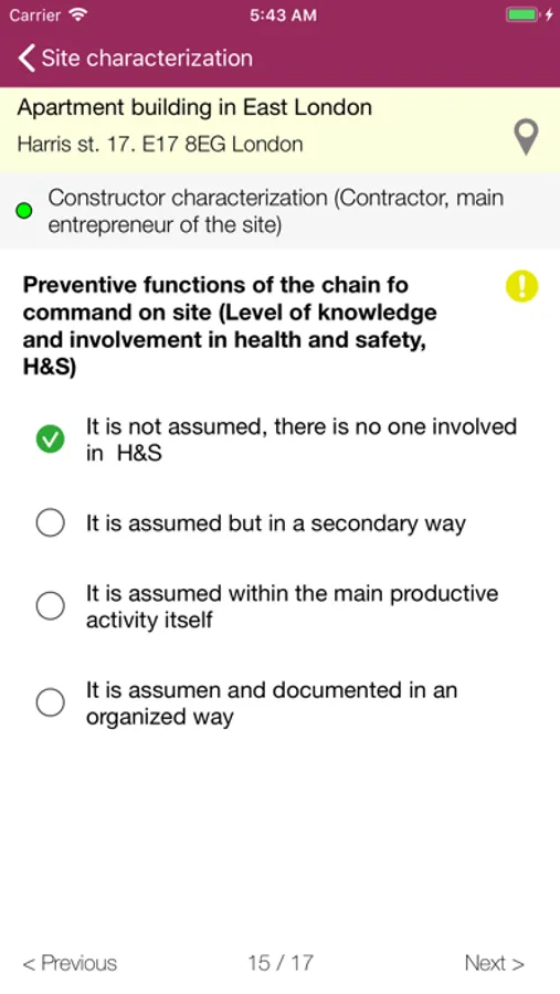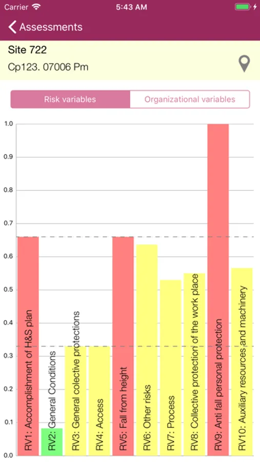 After answering a set of questions asked by the App, you will obtain the level of risk of 10 variables composed by different items of site. This level of risk will be classified according to a three point scale. Additionally, you will obtain the assessment in 10 organizational variables which affect risk on site.