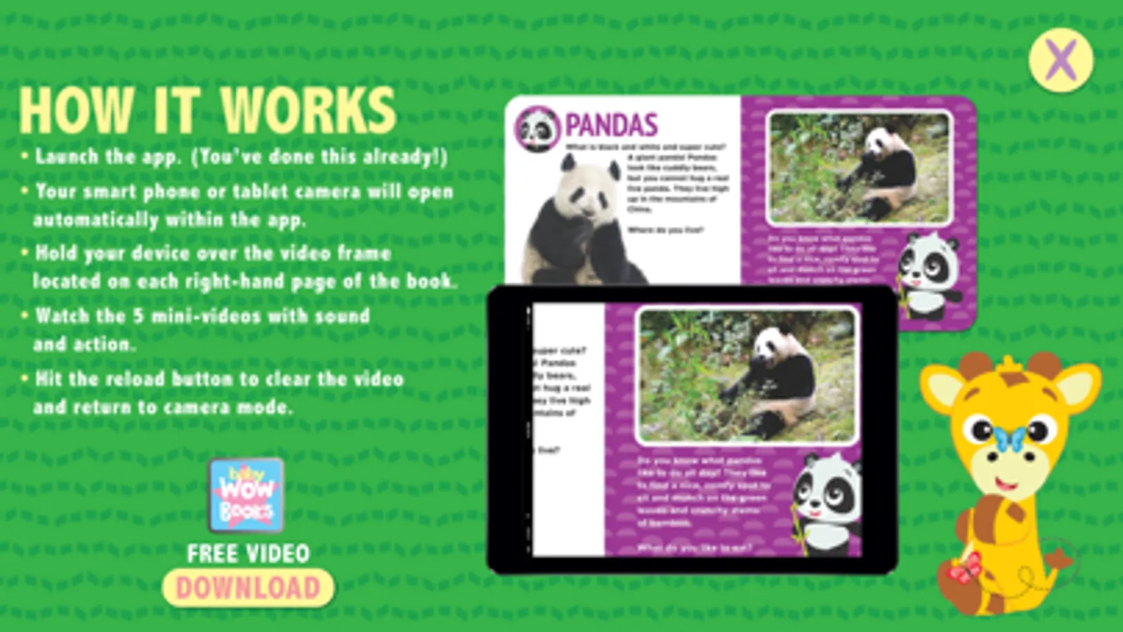 Baby WOWBooks lets children read and interact with live videos and sing along while learning about important topics. Just download the app to your smart device, launch the app, and then by holding your device over the image in the picture frame, the video will play. Children will learn fun facts on each of the subjects while they experience the subject through video. Each book also includes 8 downloadable videos.