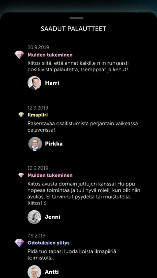 Easy way to give feedback with simple to use and beautiful mobile app. Give positive feedback as a diamond with category value, free text or boost it to a megadiamond - or just give a simple ‘thank’ with one click.