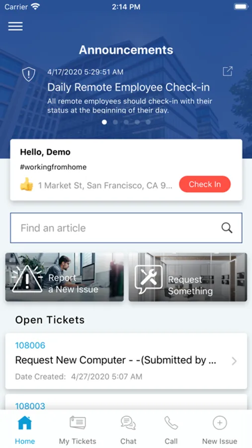 Submit a service request in record time, using Face ID to login and 3 taps or fewer to add photos, your location, and complete your request. Get real-time updates on tickets and chat with the help desk right in the app!