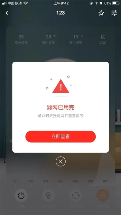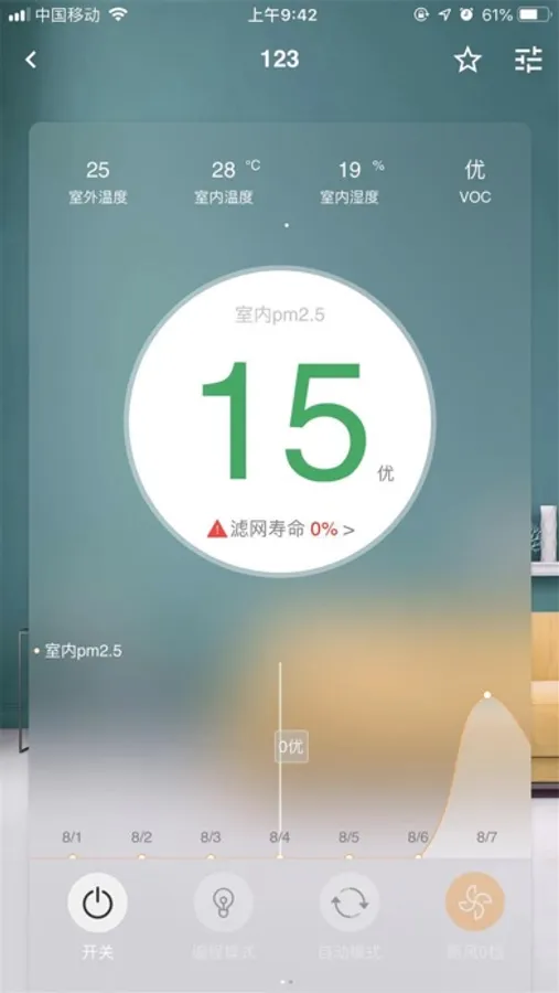 远程对机器实时操作、风量调节和模式转换、滤网寿命、对室内pm2.5和温湿度查看、滤网更换提醒