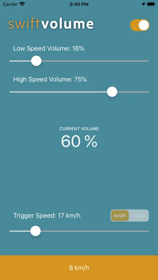 Swift Volume allows you to control your volume based on your speed. Designed for athletes or any speed junkie that wants to hear their music while they're cruising and still be able to hear their surroundings or have a conversation when they stop.