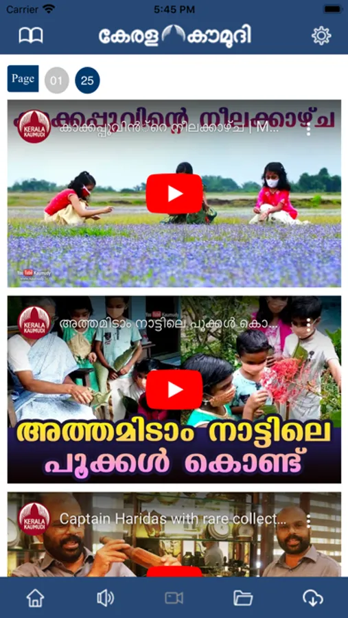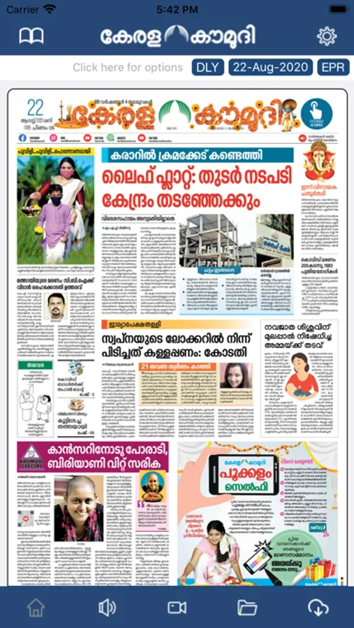 The default setting opens the day’s extended ePaper which is customisable in settings. Live TV icon takes the user to the livestreaming of the Kaumudy Television Channel.User has the option to tap to view ePaper Mapped Page.