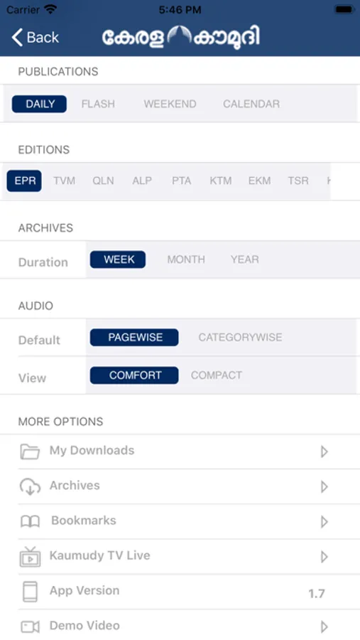 It includes all Kerala Kaumudi Publications, Editions, Customisable Archives Duration, Default Publication, Default Edition, Default Audio Grouping etc