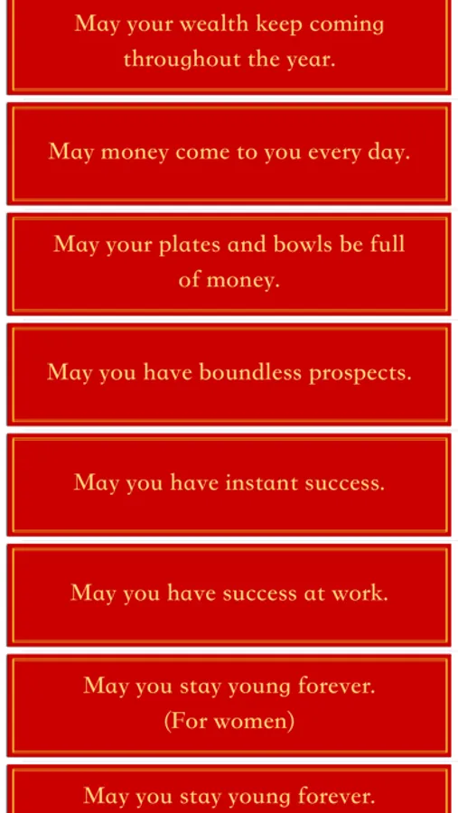 There are 138 popular lucky phrases in this app. These phrases are related to Chinese New Year, Rat Year, luck and fortune, peace and seasons, health, the elderly, family, students/kids, love, business, career, money, success, beauty, and numbers. Each written greeting has an English version and a Chinese version. The Chinese version contains a scroll with four Chinese characters. The app speaks Mandarin and Cantonese.
