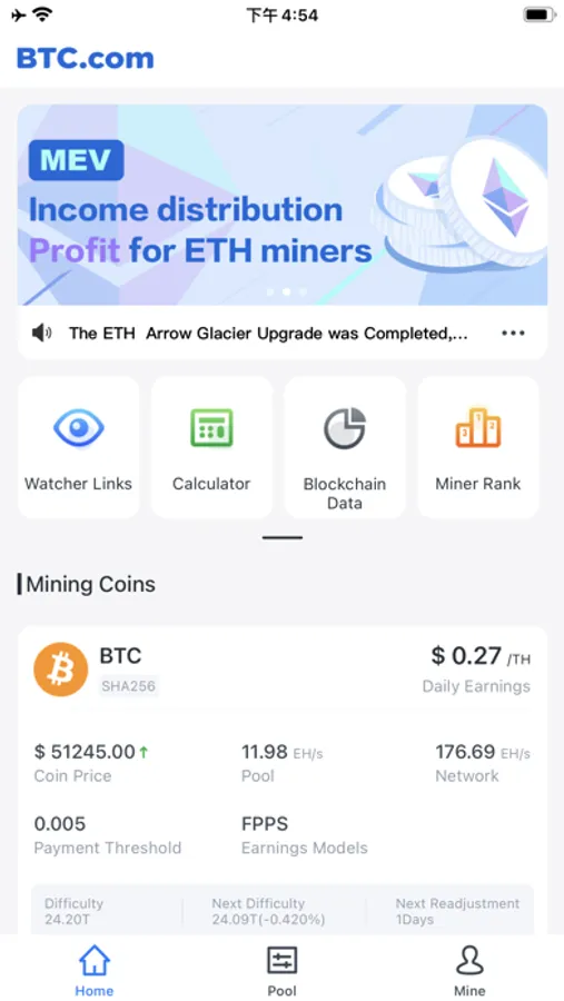 2.【Mining】Supports monitoring mining data and hashrate alert.