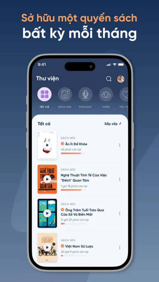 Các nội dung bạn đã mua hoặc đã thích đều được lưu trữ trong thư viện để thuận tiện theo dõi. Ngoài Sách nói, bạn cũng có thể quản lý các nội dung Ebook, Tóm tắt sách, Thiền, Truyện ngủ, Nhạc chủ đề.