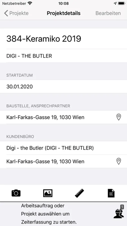 - Projekterfassung mit Baustellenadresse, Ausführungszeitraum und Fotos (z.B. Skizzen, besondere Hinweise)