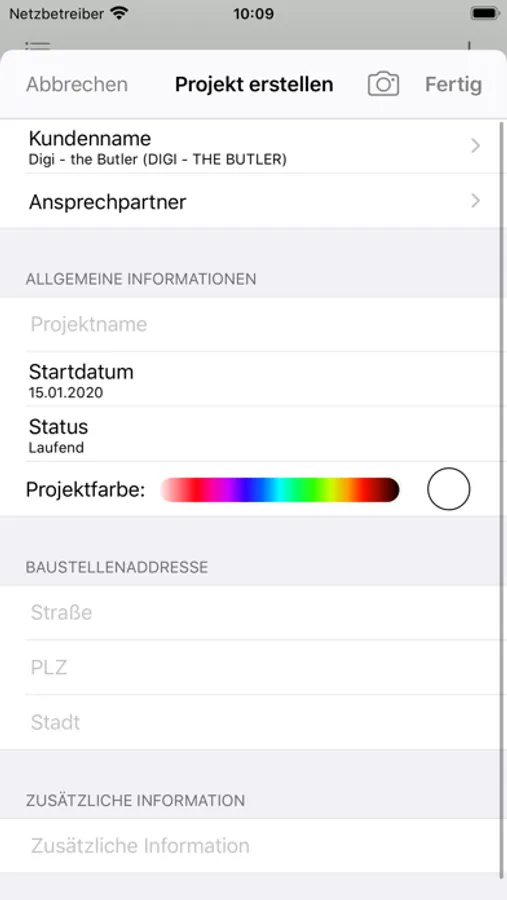 Die Projekte können mit einem aussagekräftigen Titel, dem geplanten Ausführungszeitraum und der Baustellenadresse hinterlegt werden. Im Weiteren können auch Fotos hinzugefügt werden.