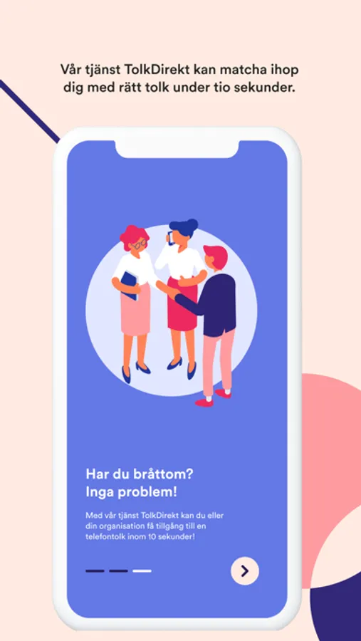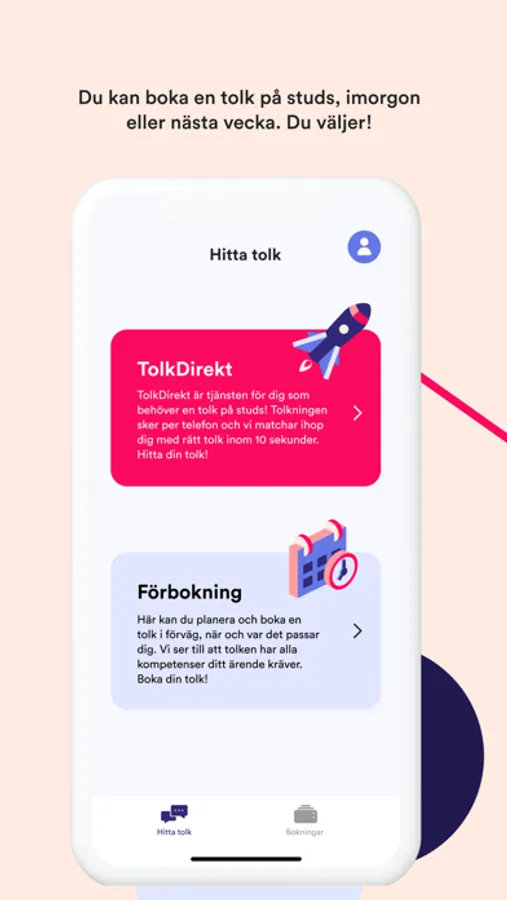 I Transvoice app Tolk! kan du smidigt och enkelt förboka eller använda verktyget TolkDirekt för att få direkt tillgång till tolk.