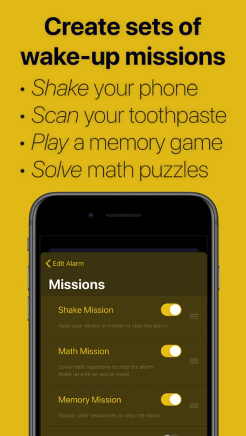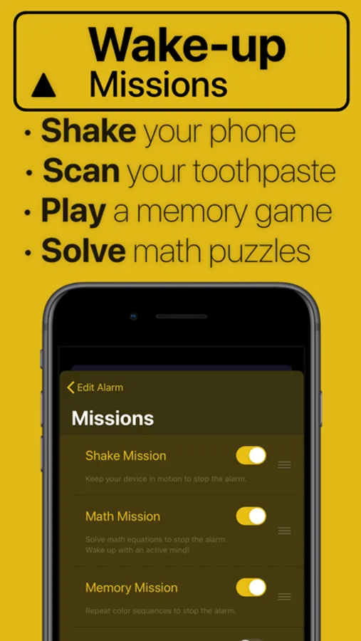 Completing wake-up missions shuts off the alarm and leaves you fully awake and alert. They stimulate the higher functions of your brain and they're fun too!