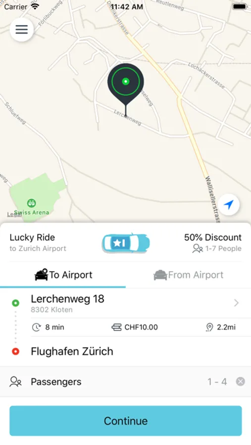 Sie sind in der Stadt Zürich und suchen eine Fahrt zum Flughafen? Womöglich haben Sie Glück. Unsere Taxis sind täglich unterwegs und können Sie auf der Rückfahrt zum Flughafen gleich mitnehmen. Beim Lucky Ride profitieren Sie von 50% Rabatt auf den herkömmlichen Fahrpreis.