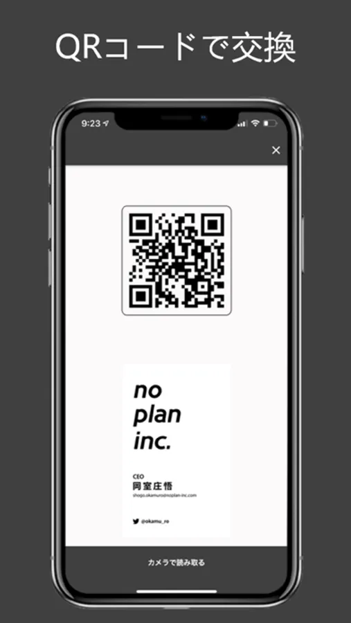 カメラアプリにQRコードをかざすことでアカウントを持っていなくても名刺交換を完了でき、