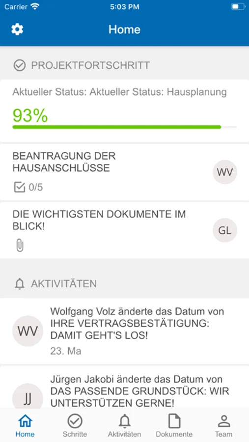 Projektfortschritt, erhalten Nachrichten und Dokumente. Dazu