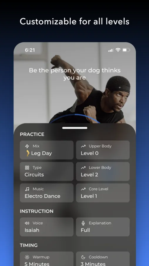 Choose from 4 different levels of Upper Body, Lower Body, and Core to get exercises that challenge you