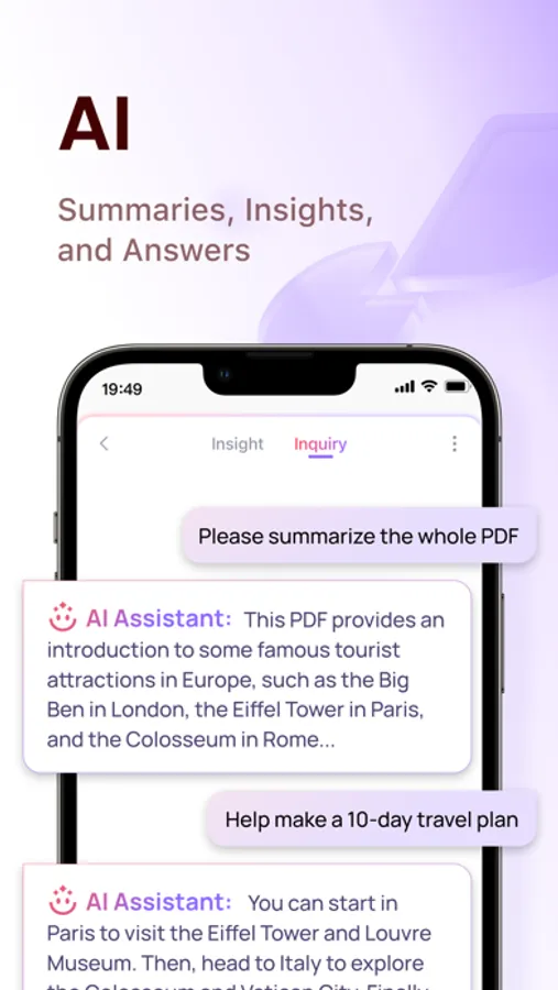 • Engage in conversations with the WPS AI and gain insights, summaries, outlines, tailored answers and translations about the PDF as you like