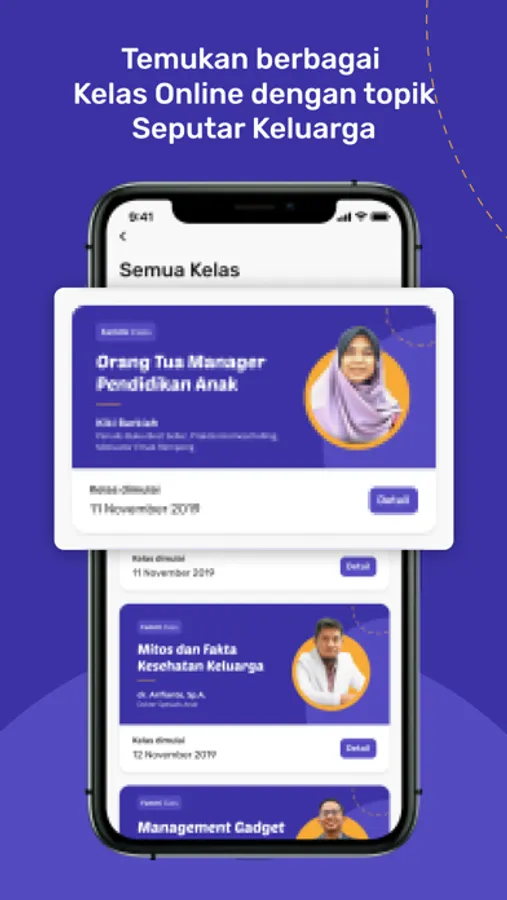 Anda akan menemukan kelas-kelas seputar edukasi keluarga meliputi: pernikahan, parenting, perkembangan anak, oendidikan karakter anak, membangun bisnis dari rumah, pendidikan pra-nikah, pendidikan di era digital, pendidikan pubertas dan banyak lagi yang lainnya.