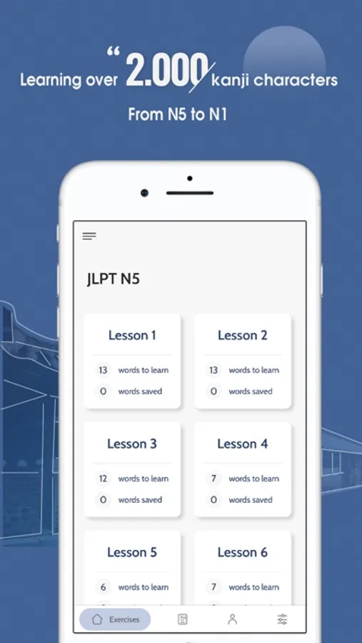 - Kanji divided by levels from N1 - N5 or challenging with no level division