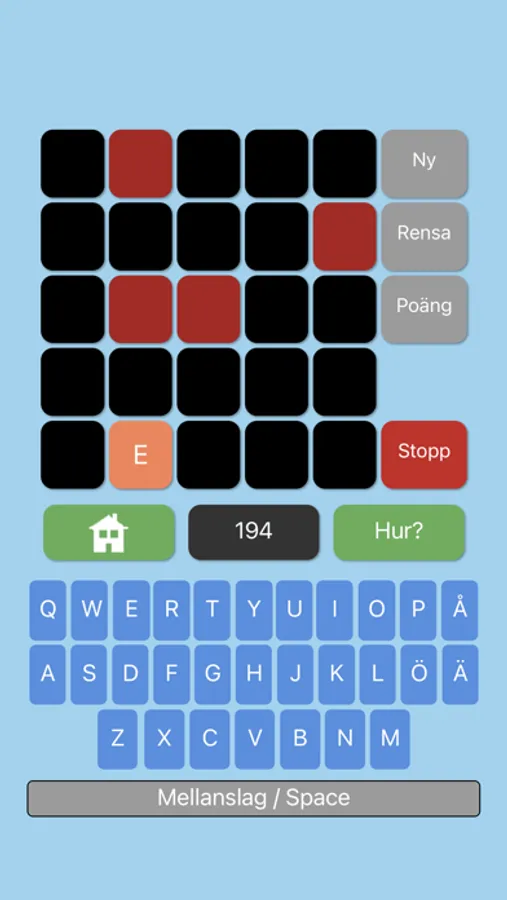A board with 25 squares is presented with a starting letter in an orange button, some (2-4) red buttons (not for use) and the rest is black.