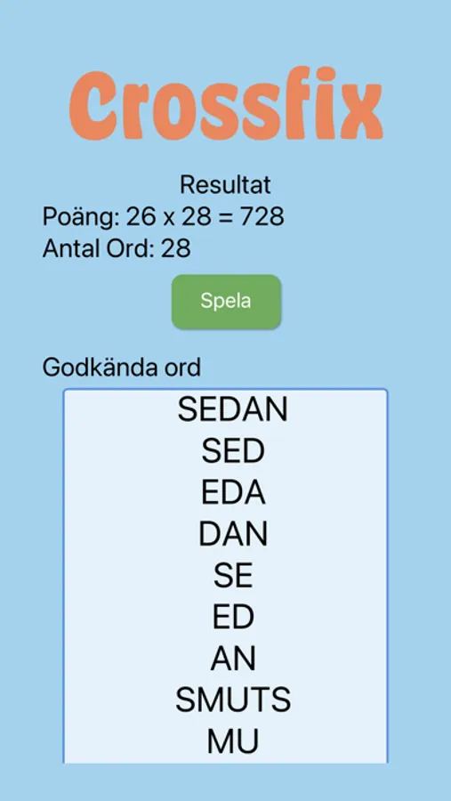 When you are satisfied filling out all words and letter (or anytime really) you press Done to have all letters and words checked with the dictionary. Your score is based on the letters included in the words, multiplied with number of validated words. This sum is then multiplied with the time left. EXAMPLE: If you write: CAMEL you get points for CAM, EL MEL etc. So you get points several words in one. Note that all Duplicates are removed before calculating is done!