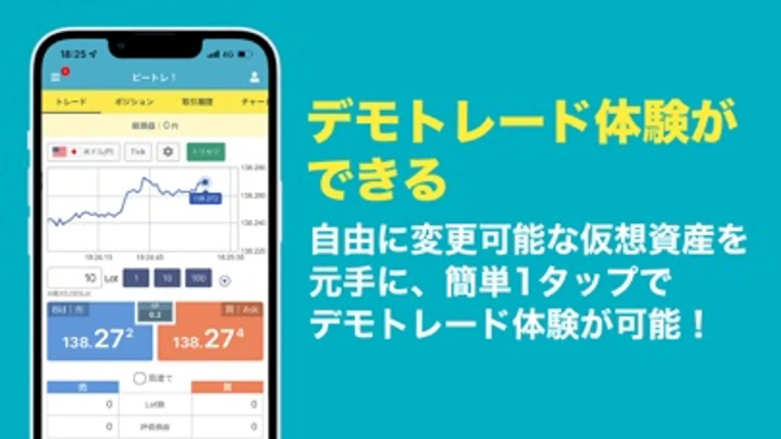 自由に変更可能な仮想資産を元手に、簡単1タップでデモトレード体験が可能!