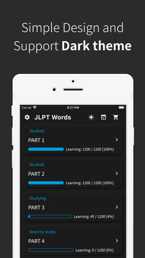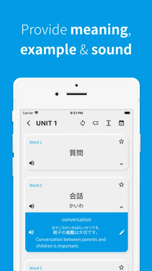 All Japanese words are installed with the app when you download the app. So you can study Japanese vocabulary anytime and anywhere.