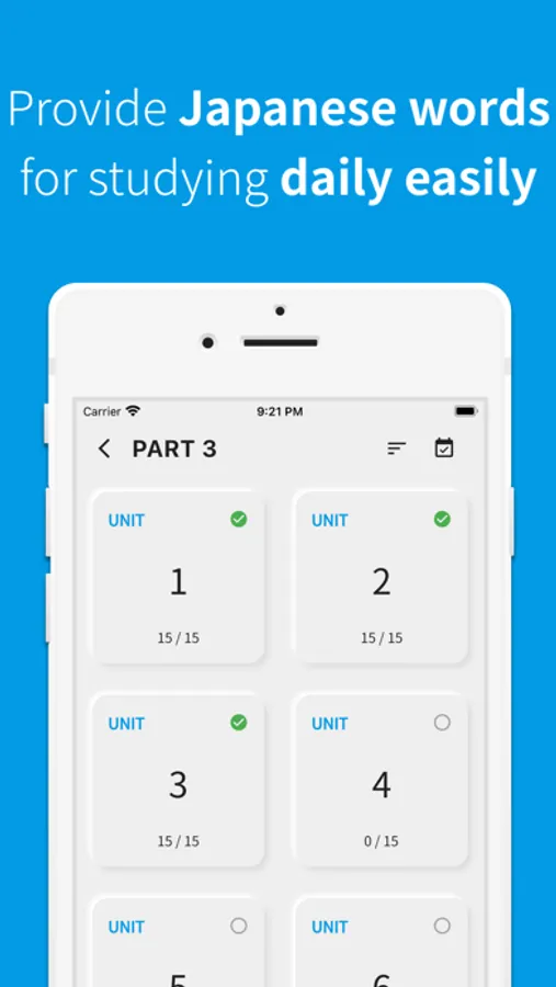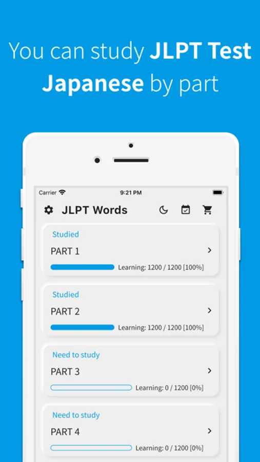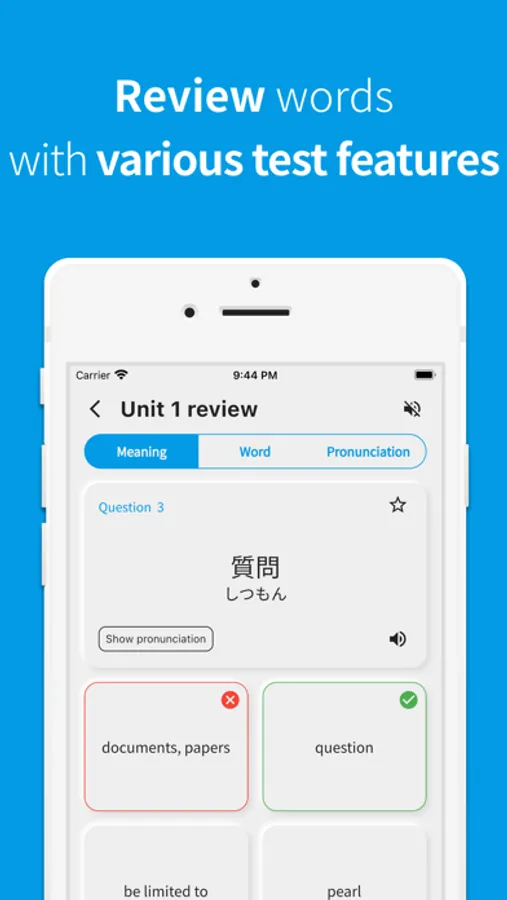 It is important to study words every day! You can review the studied Japanese vocabulary by part, unit, or whole words.