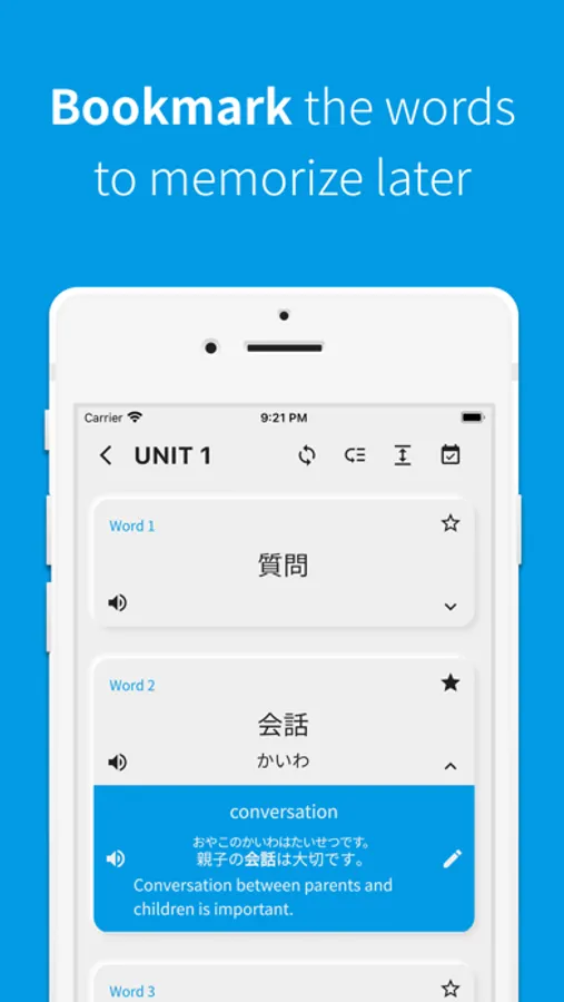 - Bookmark: you can press the star button to add the word which you couldn't memorize well to the bookmark.