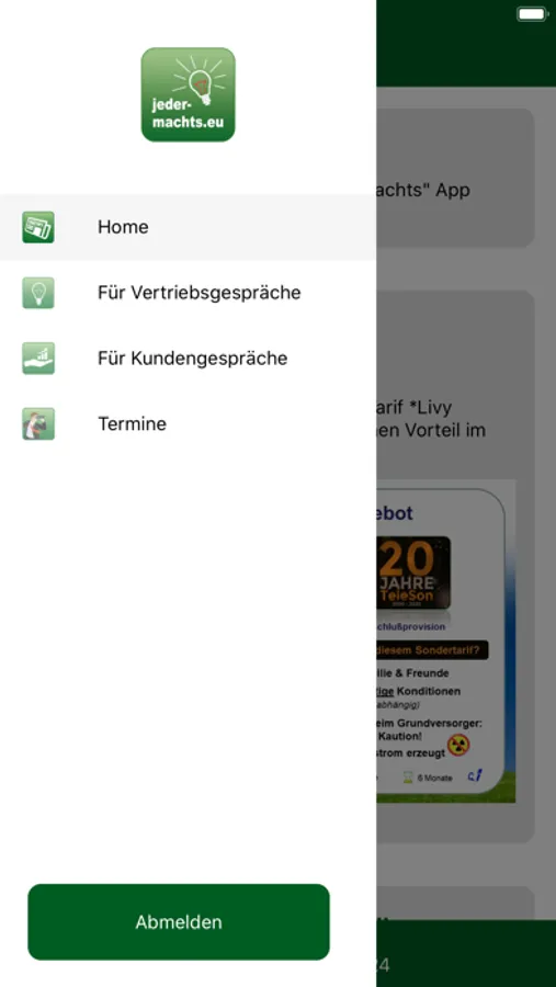 Wir bieten mit der „jeder machts“ App ein Beratungswerkzeug für den Vertriebspartner von Strom, Gas, Wärme bis hin zum Thema Sicherheit für zuhause: grundsätzlich kostenfrei! Als Nutzer der App in unseren „jeder machts“ Team haben Sie mit der „jeder machts“ App blitzschnell und kinderleicht sämtliche Unterlagen die Sie zur Kundenberatung & Gewinnung benötigen – egal wo Sie sind.