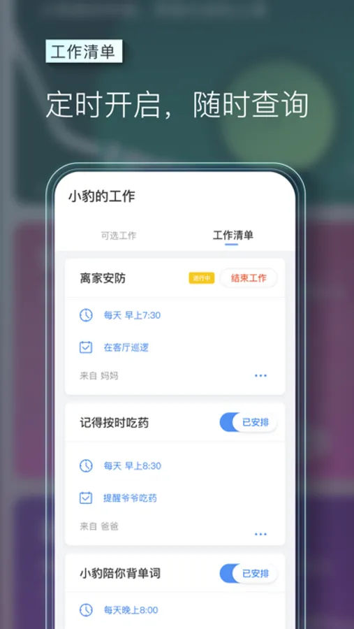 - 可通过此应用程序添加、编辑、关闭豹小秘mini机器人的工作清单