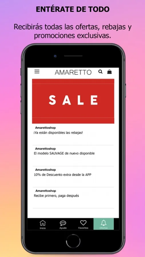 Pero, ¿qué me ofrece exactamente la app de AMARETTO? Administrarás tu cuenta de cliente, recibirás alertas, podrás crear una lista con los artículos que más te gusten, podrás ver el catálogo completo de productos…Pero amiga, lo más importante que te ofrece nuestra app es: