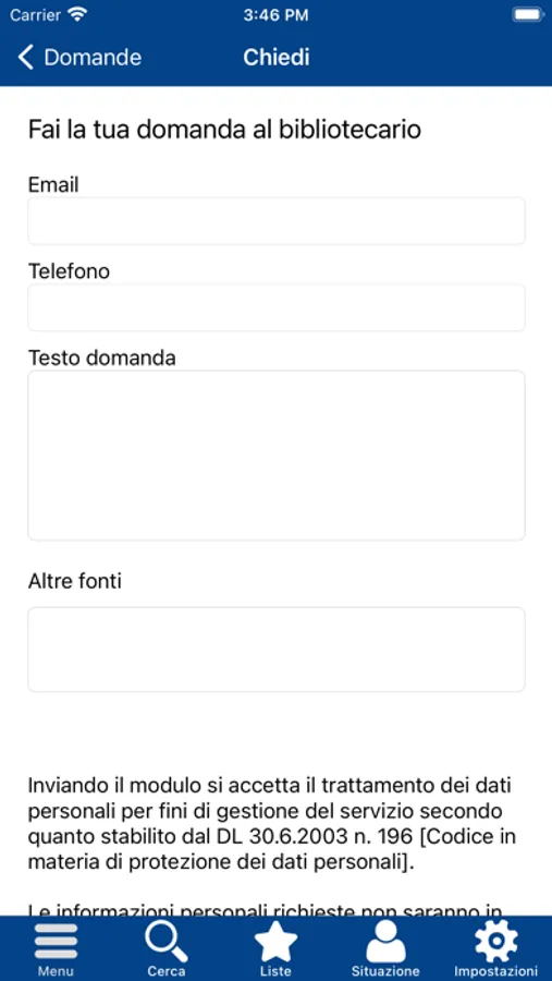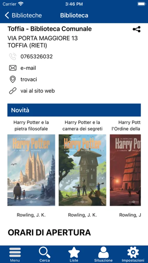 • consultare l’elenco biblioteche e mappa con relative informazioni (indirizzo, orari…)
