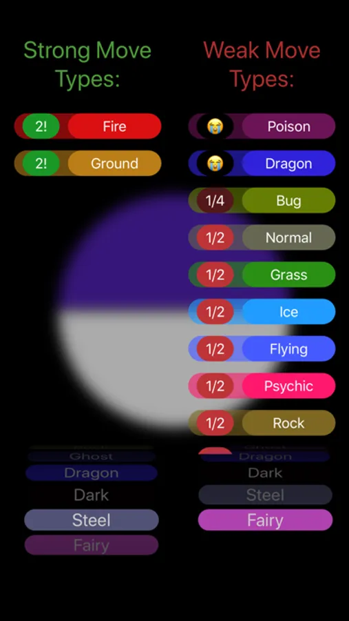 Don't dig for another chart on the weaknesses of a specific type of mon again! Select the types of the mon you're facing at the bottom and get instant information on which move types will be effective or not!