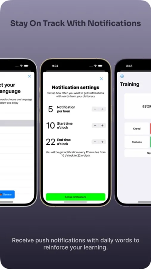 Daily Challenges and Notifications: Stay motivated and engaged with daily challenges that reward your commitment to learning. Receive notifications to keep you on track and excited about your language learning journey.