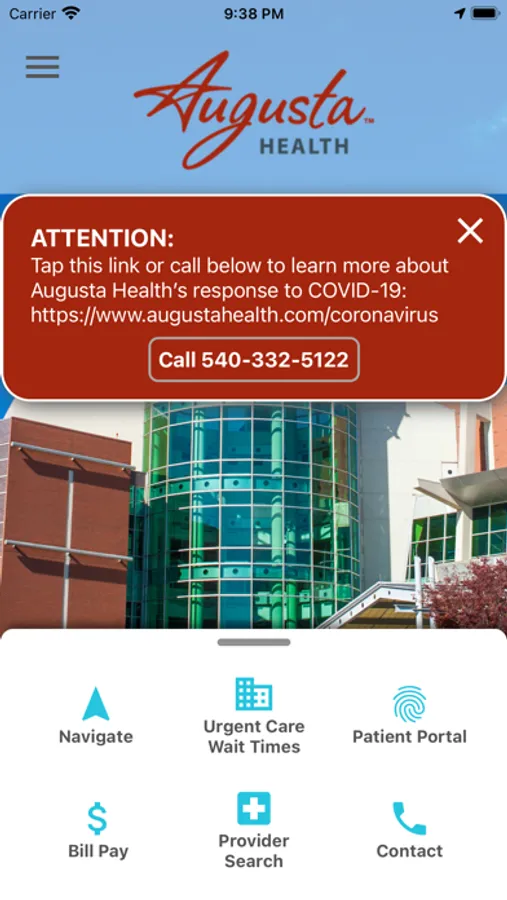 The Augusta Health app is your gateway to Augusta Health. See wait times and check in at our urgent care centers, get easy access to your patient portals, and seamlessly contact Augusta Health. You can also use the the Augusta Health app to navigate our hospital building! Get to the best parking lot, to the best entrance, and right to your appointment! The Augusta Health app boasts an "indoor GPS" to help you during your visit. Easily find exactly where you need to go, visit the nearest restroom, and share locations with loved ones so they know exactly where to find you in the hospital.