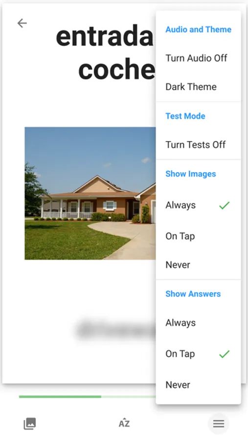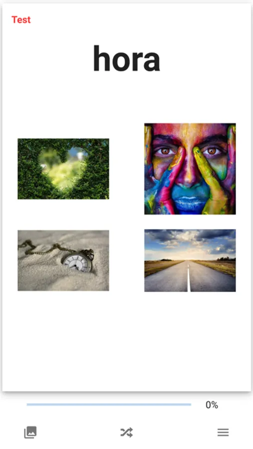 There's a test at the end of each set of words - mutliply-choice press the image style - and you can see your best score for each set in the deck list.