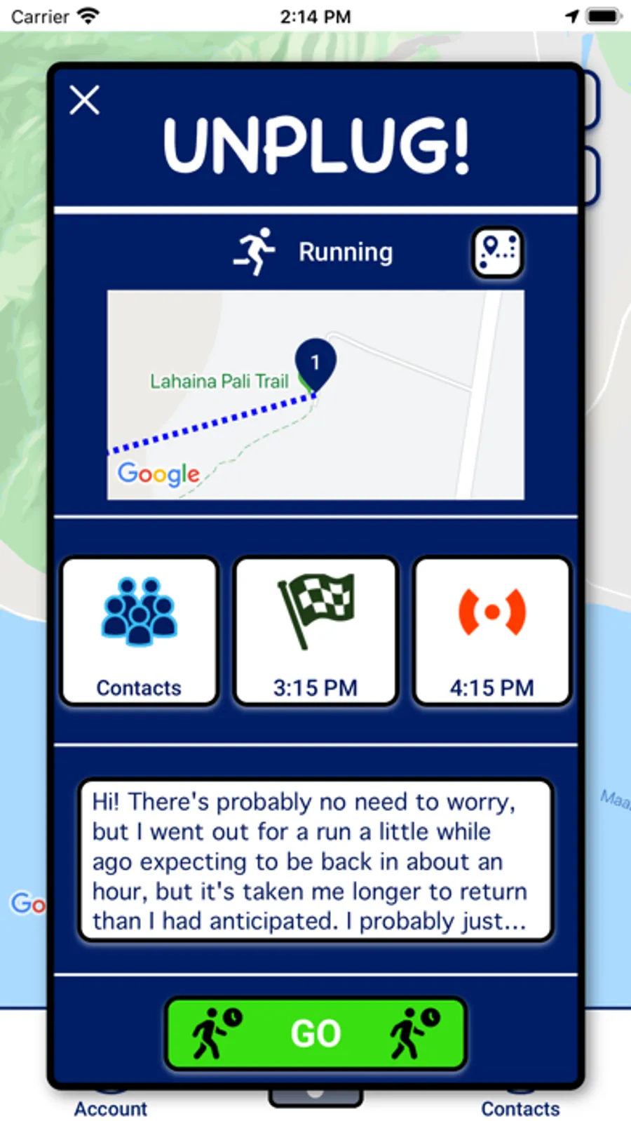 Unplugged Adventurer allows you to plan out any adventure (hiking, running, backcountry skiing, a social night out on the town, etc.), select your safety contacts, and then specify when you are expecting to be done. In the unfortunate event that something unexpected happens during your activity, Unplugged Adventurer will share out the activity details with your predetermined safety contacts. At this point they'll be able to best determine what steps to take to ensure you're safe and sound.