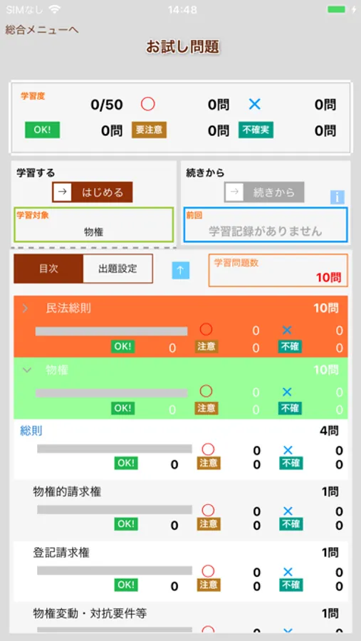デフォルトでは標準的な体系に従って問題を配列してあります。テキストを読み進めながら、節目ごとに当アプリで肢別に知識チェックしていけば、メリハリのある実戦的学習が可能になります。もちろん、出題順をランダムに設定することも自由にできます。