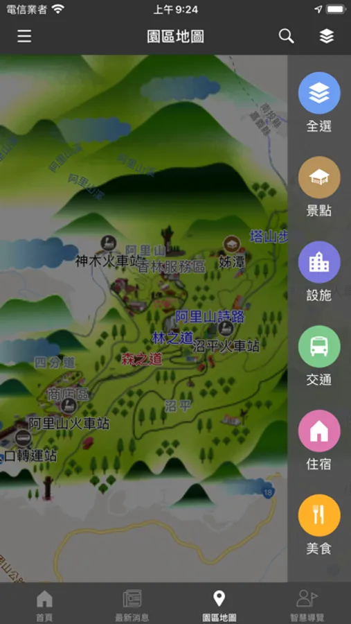 「森遊阿里山」提供完整之園區地圖及步道路線資訊,並透過線上步道環景以及創新之主要場館3D實景,讓遊客即可透過數位分身(Digital Twin)來線上體驗園區之環境精隨。