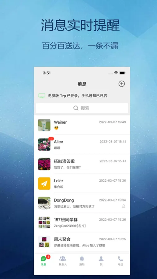 跨平台:支持电脑端和手机端消息同步和发送