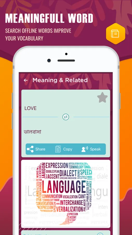 English to Bangla Offline comprehensive dictionary on the store with meanings, examples, thesaurus (synonyms and antonyms), parts of speech, relation with words, pronunciation (both in Bangla and English) and text-to-speech guide.